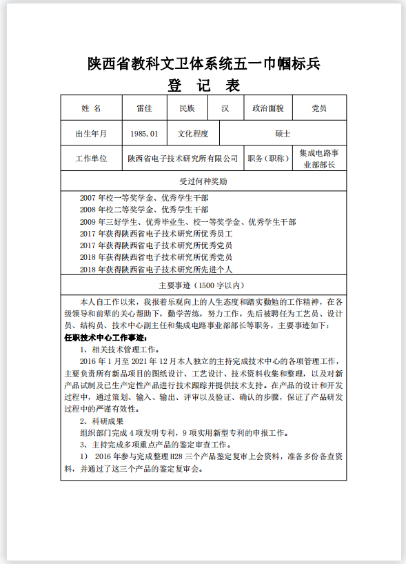 凭证陕西省教科文卫体工会委员会《关于推荐评选2022年“陕西省教科文卫系一切五一巾帼尖兵(岗)”的通知》,集团公司工会拟推荐信息工业部电子综合勘探研究院的陕西省“四主体一团结”土体工程手艺研究中心办公室、陕西纺织器材杂志社有限责任公司编辑部参评陕西省教科文卫系一切五一巾帼尖兵岗,推荐信息工业部电子综合勘探研究院马丽同志、陕西省电子手艺研究所有限公司雷佳同志、陕西省现代修建设计研究院有限公司韩丹丹同志参评陕西省教科文卫系一切五一巾帼尖兵,现将相关质料予以公示。