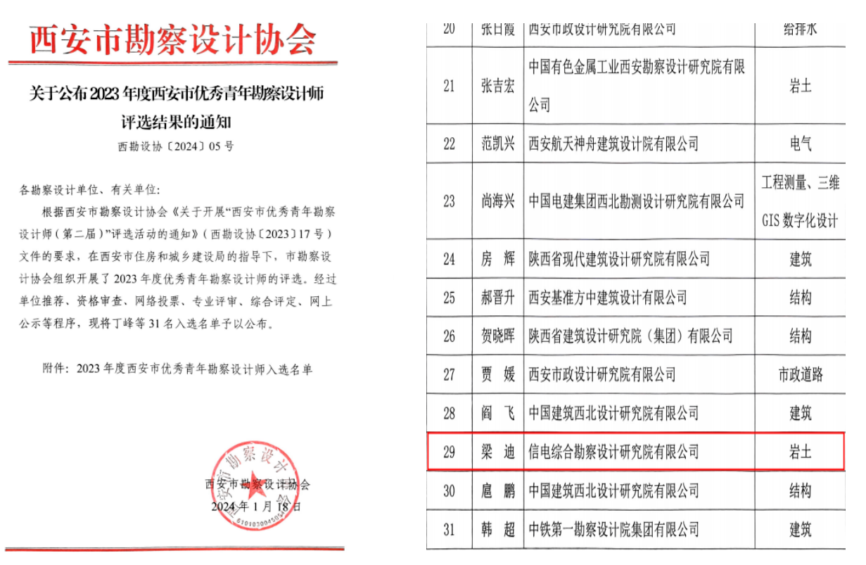 凭证西安市勘探设计协会《关于开展“西安市优异青年勘探设计师(第二届)”评选运动的通知》(西勘设协〔2023〕17号)文件要求,在西安市住房和城乡建设局的指导下,市勘探协会组织开展了2023年度优异青年勘探设计师的评选,经由资格审查、网络投票、专业评审、综合评定、网上公示等程序,电勘院梁迪同志荣获西安市“优异青年勘探设计师”称呼。